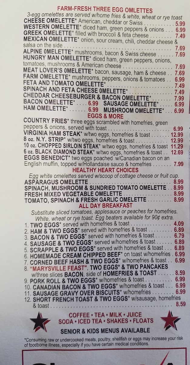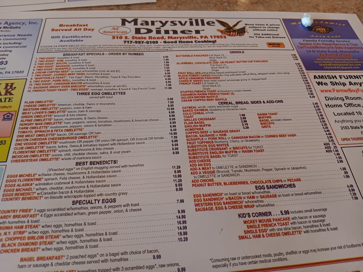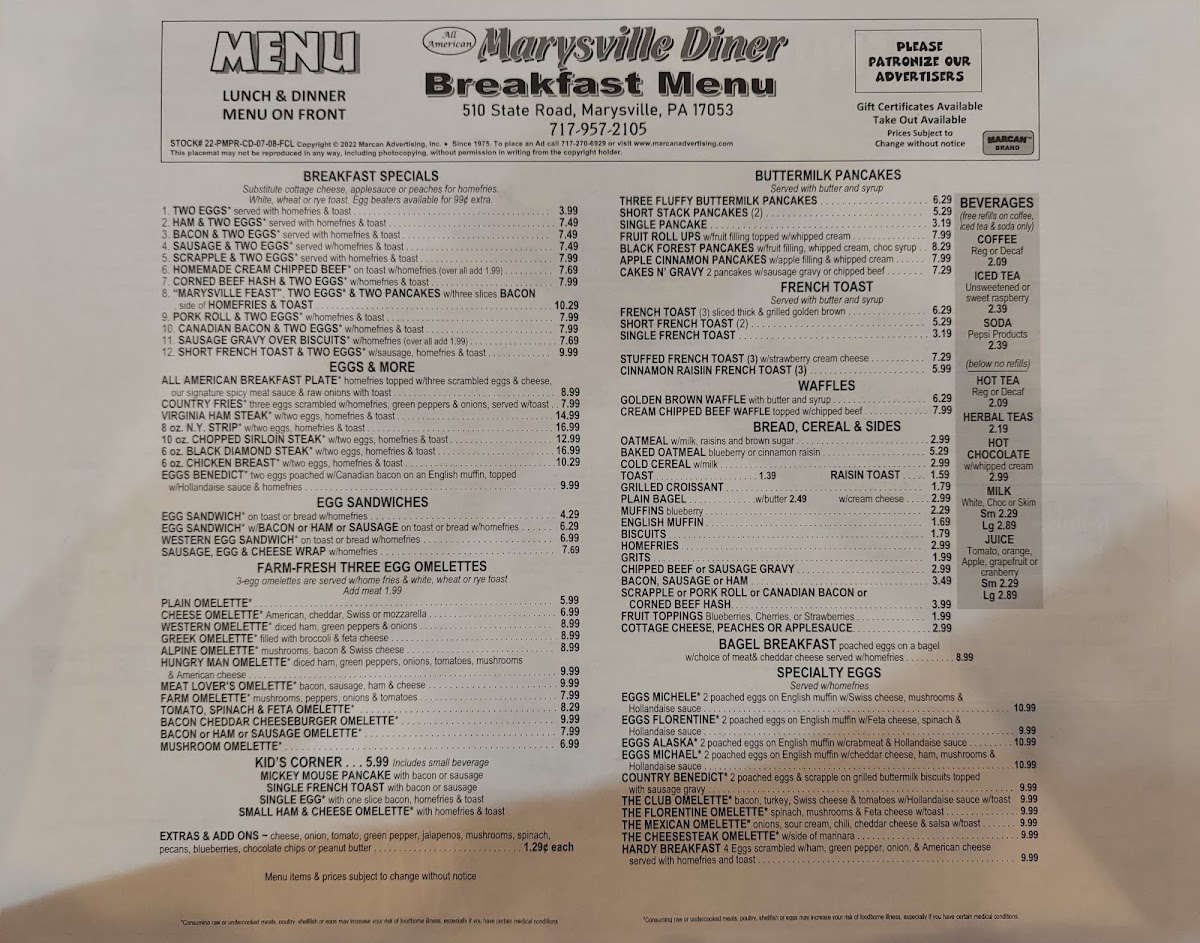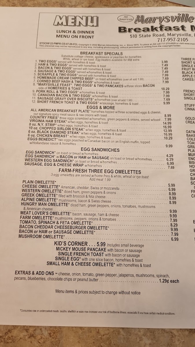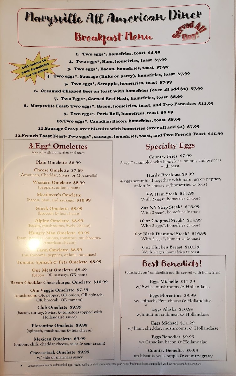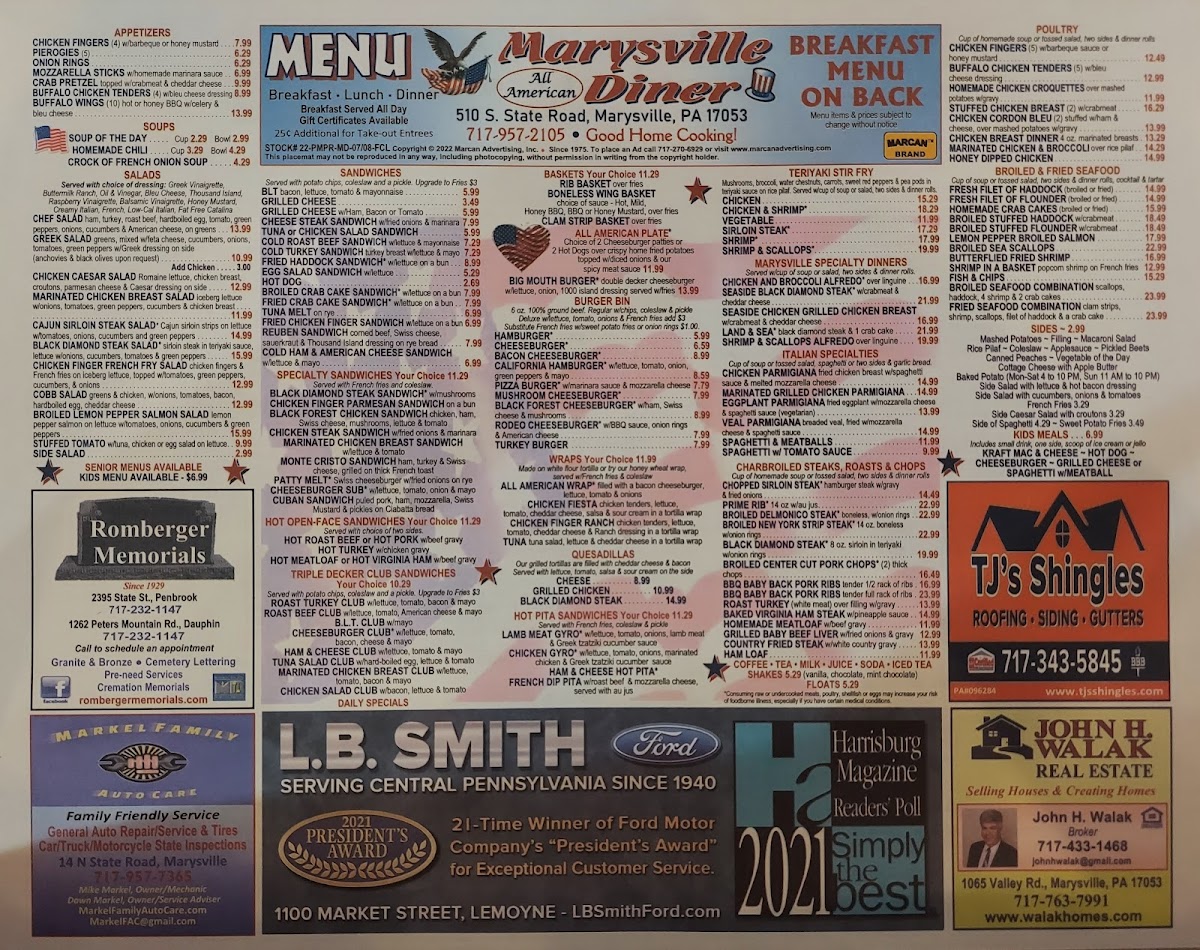 Welcome to the Marysville All American Diner, your quintessential American diner located at 510 S State Rd, Marysville, PA. This cozy eatery boasts a diverse menu that caters to every appetite. Start your day with their renowned Three Egg Omelettes, featuring tasty options like the Hungry Man or the Greek Omelette. For heartier meals, explore their Marysville Specialty Dinners, including a sumptuous Chicken and Broccoli Alfredo and a mouthwatering Seaside Black Diamond Steak.